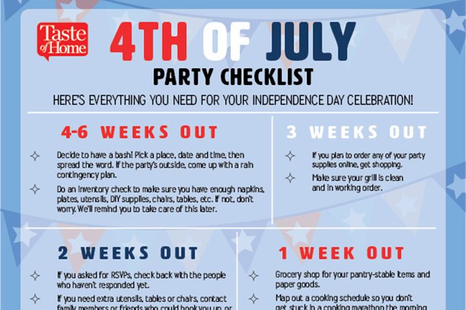 Start your Independence Day plan with a menu that echoes the Stars and Stripes. Bake a flag cake covered with strawberries, blueberries and whipped cream; toss up a party mix with colorful candies; or make an appetizer pizza with tomatoes and Kalamata olives. Or, get jiggly with it and layer up a festive Jell-O salad.
