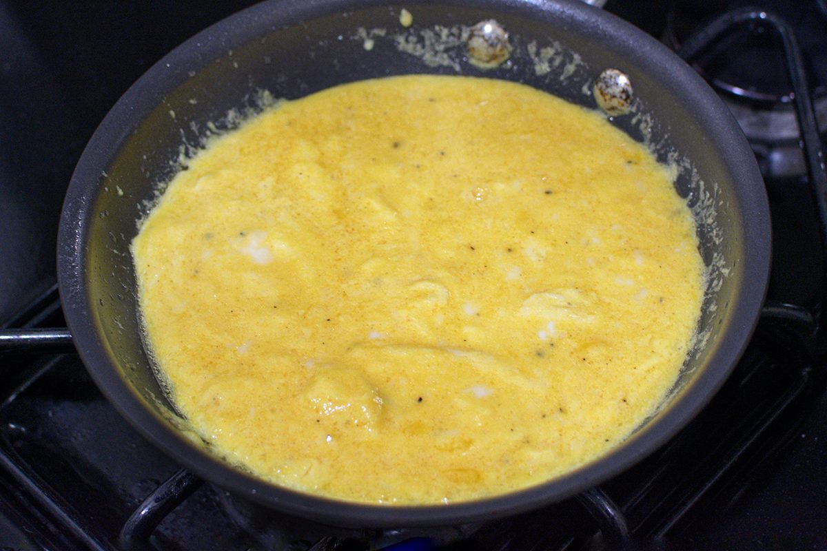 Once I poured the eggs into all that melted butter, it was time to get things moving with a rubber spatula! Teigen describes the motion as “allllll around the pan circular scrape, followed by a push push push of the eggs from the outside toward the center.”