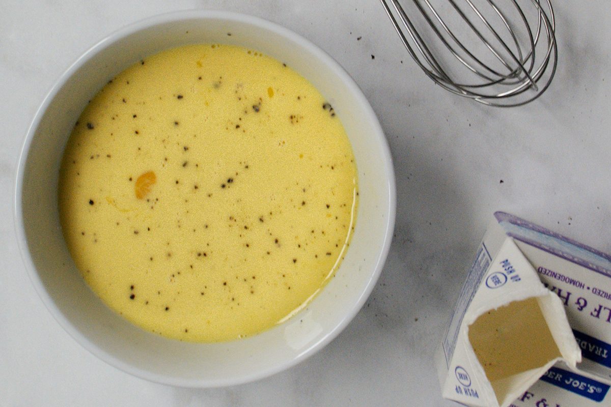I started out with enough butter to make Chrissy proud and a healthy portion of her secret ingredient, cream. I added about 3 tablespoons of half & half to the four eggs I prepared. I thought it might be too much cream, but once everything was whisked together, the bright yellow color of the eggs showed it’s the perfect amount.