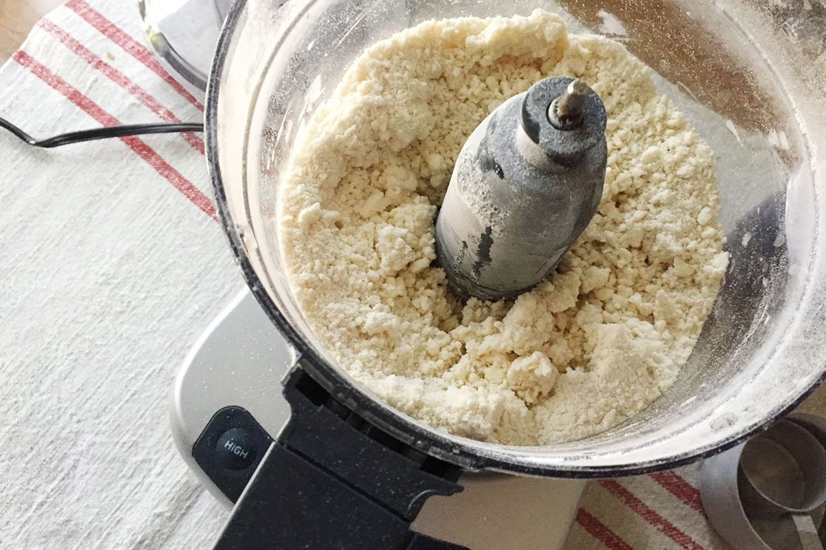 To make the dough, I blended the flour and salt. Then I pulsed in cold, cubed butter until the butter was broken down into pea-sized pieces.