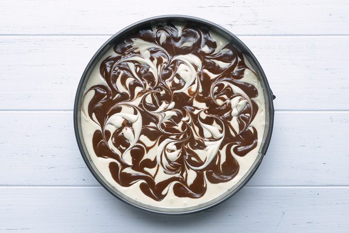 For a more abstract effect, you can add a marble finish to your cheesecake. This works really well for cakes that use two flavors of batter, like this chocolate brownie swirl cheesecake.