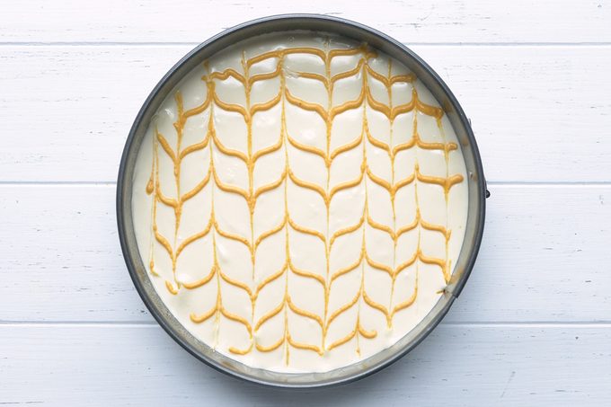 Start by piping straight lines of either jam, caramel or even just some cheesecake filling that you’ve dyed a festive color. Then take a toothpick and drag it across the cake. First, go in one direction, then for the next pass, go in the opposite. The result is something the Golden Girls would surely love.