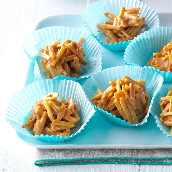 When you’re making multiple holiday cookies at once, it’s a good idea to have a few no-bake options that don’t monopolize the oven. This haystack recipe requires no baking, only refrigeration, and features only three ingredients: semisweet chocolate chips, butterscotch chips and chow mein noodles.