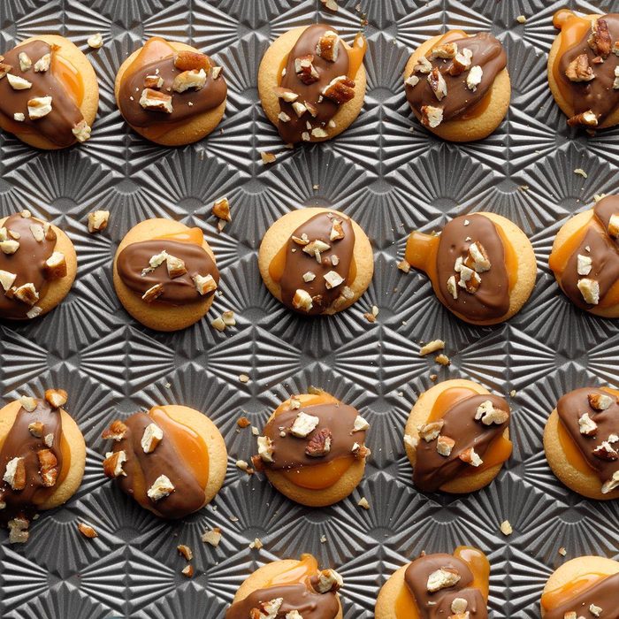 Holiday recipes don’t have to be complicated and time-consuming, and this cookie recipe proves it. Just drizzle some melted caramel on some store-bought vanilla wafers, top each cookie with a chocolate square and add nuts if you wish.
