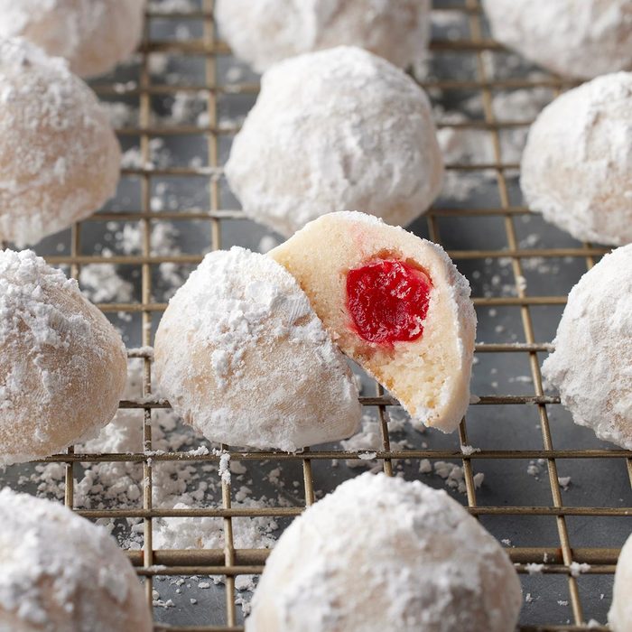 Your guests don’t have to know that these sugar-dusted cookies took you only 35 minutes to prep and bake. Best of all, each one has a maraschino cherry hidden inside.