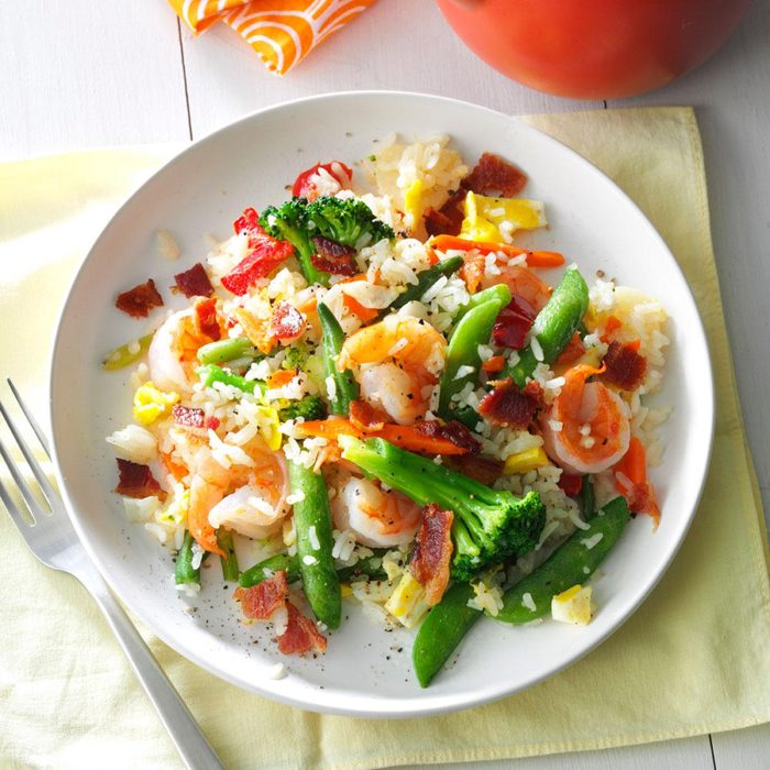This delectable shrimp fried rice is filled with color and taste that makes it vanish fast. Our family of four can't get enough of it. Bacon adds crispness and a hint of heartiness. Consider it when you need a different main dish or brunch item. —Sandra Thompson, White Hall, Arkansas