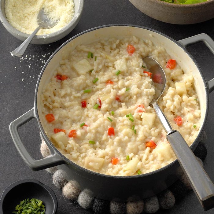 Risotto is a creamy Italian rice dish. In this version, arborio, a type of rice, is briefly sauteed, then slowly cooked in wine and seasonings. —Taste of Home Test Kitchen