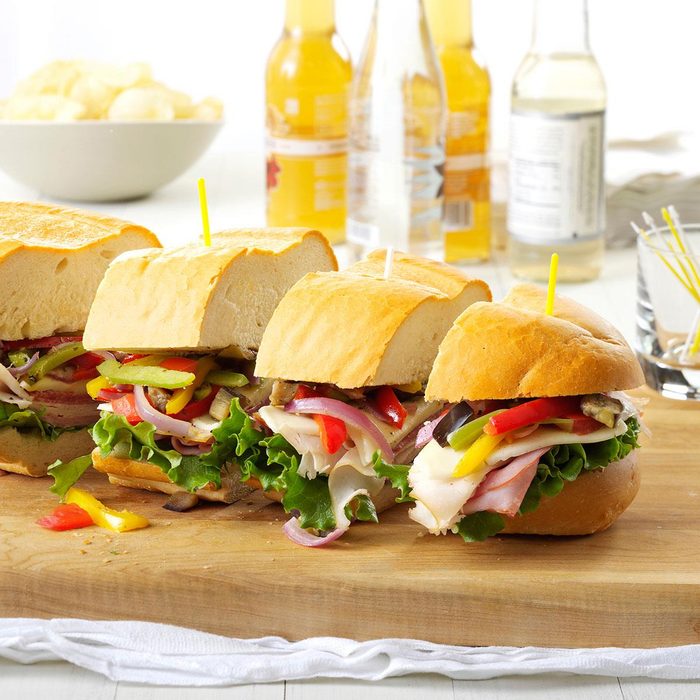 This big sandwich, inspired by one I tried at a New York deli, is a favorite with our football-watching crowd. Made ahead, it's easily carted to any gathering. Kids and adults alike say it's super. —Marion Lowery, Medford, Oregon