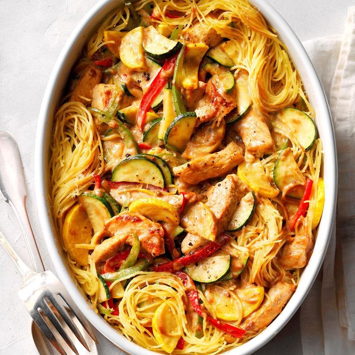 I have a number of easy, planned leftover recipes in my arsenal, which are especially useful when I'm busy. This is one of my favorites: pasta from Monday plus roasted chicken from Tuesday equals this delicious dish on Wednesday. When paired with a green salad and toasty bread, you have a meal that's fancy enough for company. —Brenda Cole, Reisterstown, Maryland