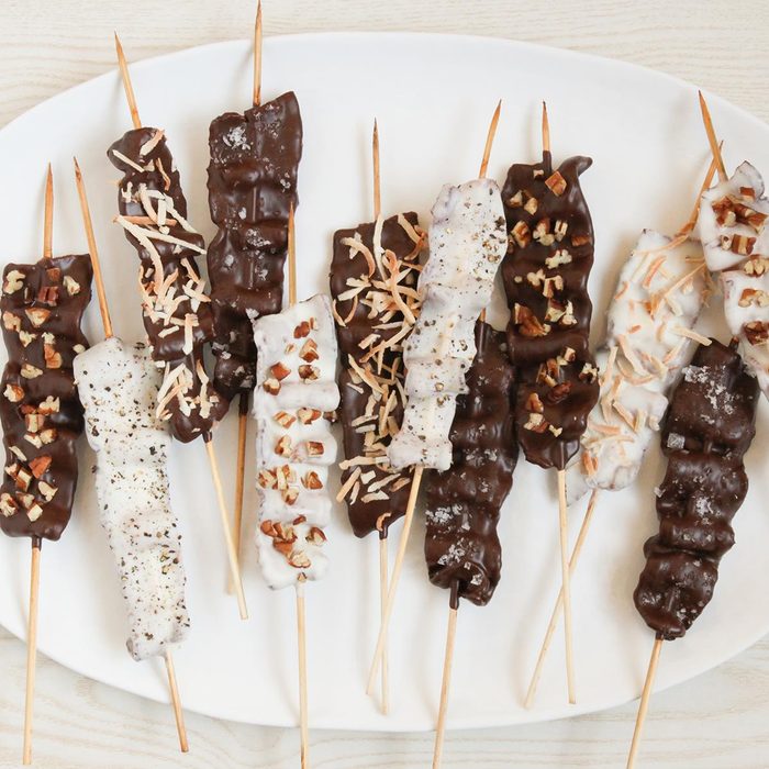 Everyone needs a fun, friendly way for kids to play with food. These rich bites are nutty and yummy. Just coat bananas in chocolate and dip them into peanuts, sprinkles or coconut. —Susan Hein, Burlington, Wisconsin