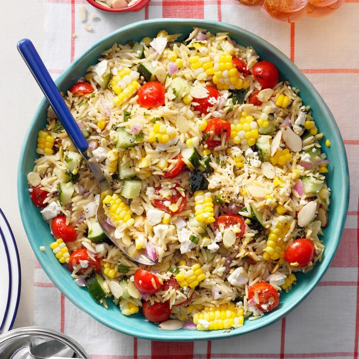 Everyone loves pasta salad, but rotini noodles can be so typical. Here, orzo gets the spotlight, and it clings so nicely to the corn, tomatoes, cucumbers, onion, capers and mint.