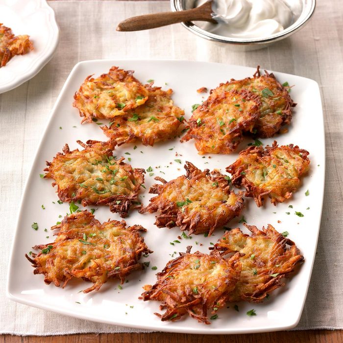 From the Recipe Creator: These potato pancakes are really versatile. They can be a side dish for just about any meal or the main course for a light meal. Potato pancakes go particularly well with pork. We have them often at our house. —Lydia Robotewskyj, Franklin, Wisconsin