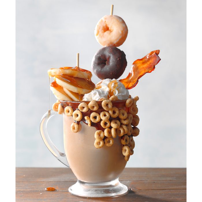 Loaded with breakfast-y goodness and enough caffeine to wake you up, this is a complete brunch to go! The shake is loaded with coffee ice cream, Irish cream and coffee liqueurs, a shot of espresso and a packet of hot chocolate mix…then decked out with whipped cream, mini pancakes, mini donuts, homemade hot fudge, cereal and bacon—with a drizzle of maple syrup to top it all off. A post-brunch nap is not included, but suggested!