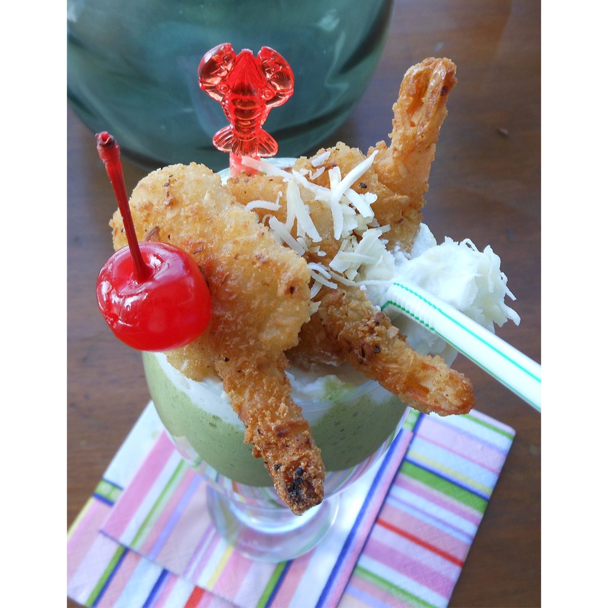 Your eyes do not deceive you, that is fried shrimp on top of that shake. This healthy alternative to a classic milkshake transforms a pineapple, papaya and spinach smoothie into a frozen treat with the addition of milk and crushed ice. Garnished with whipped cream, toasted coconut, coconut shrimp (and a maraschino cherry), this is a tropical getaway in a glass, clocking in at only 220 calories. And if you’re looking for a great recipe for coconut shrimp, we’ve got you covered.