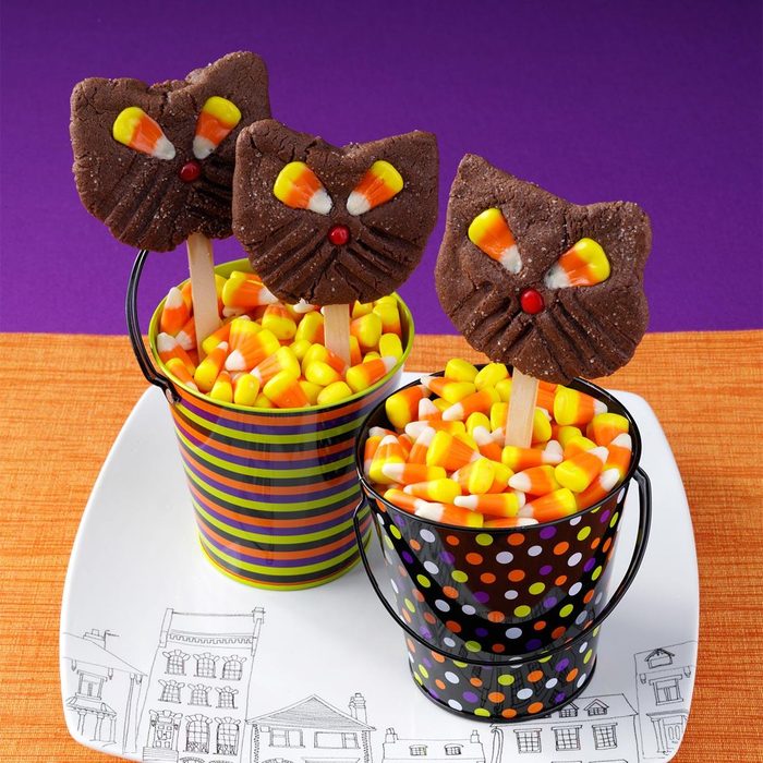 Our children look forward to helping me bake these cute cat cookies each year. They've become experts at making the faces with candy corn and Red Hots. —Kathy Stock, Levasy, Missouri