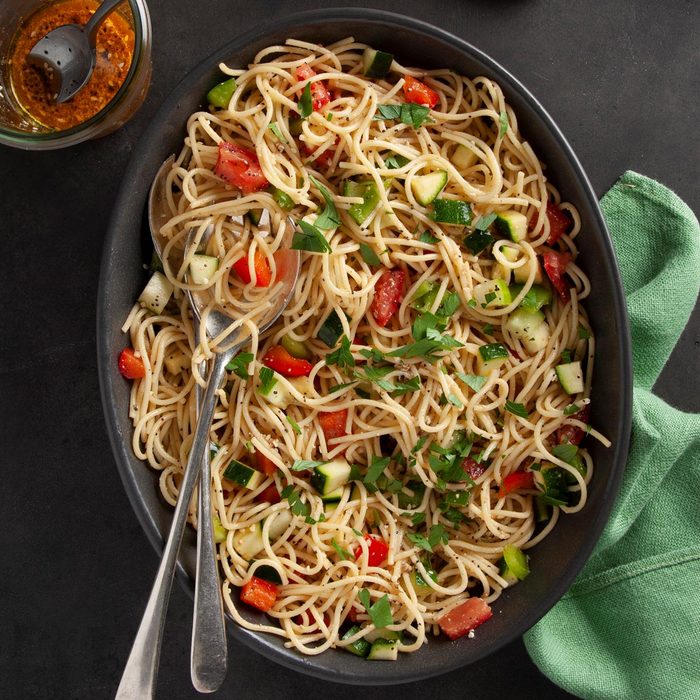 This attractive, fresh-tasting spaghetti salad can conveniently be made the night before. It makes enough for everyone! —Lucia Johnson, Massena, New York