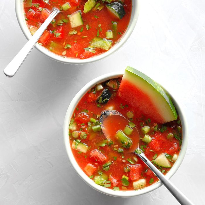 Watermelon and tomatoes may seem an unlikely pair, but they team up to make a winning combination in this eye-catching salad. —Matthew Denton, Seattle, Washington