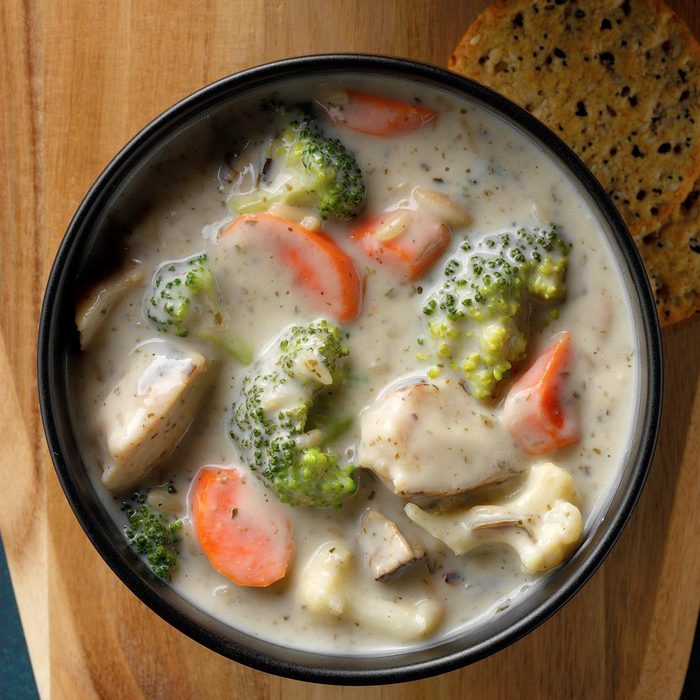 I'm originally from Minnesota, where wild rice grows in abundance and is very popular in recipes. This creamy chicken wild rice soup has been part of our Christmas Eve menu for years. To save time, I cook the chicken and wild rice and cut up the vegetables the day before. —Virginia Montmarquet, Riverside, California