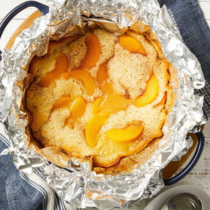 This dutch oven peach cobbler recipe has been a family classic for 60 years. We prefer peaches, but fresh cherries and berries are fun too. Almost any fruit would work. Mix and match! —Jackie Wilson, Wellsville, Utah