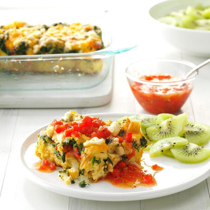 I make breakfast casseroles with whatever I have, like spinach, sweet red pepper and cheddar. With this puff, we like a burst of flavor from Greek vinaigrette. —Angela Robinson, Findlay, Ohio
