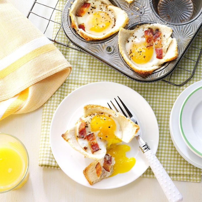This is a fun bacon and egg recipe! It can easily be doubled for a larger group. Make sure to use high-quality bacon so it doesn’t fall apart in the muffin tin. —Edith Landinger, Longview, Texas