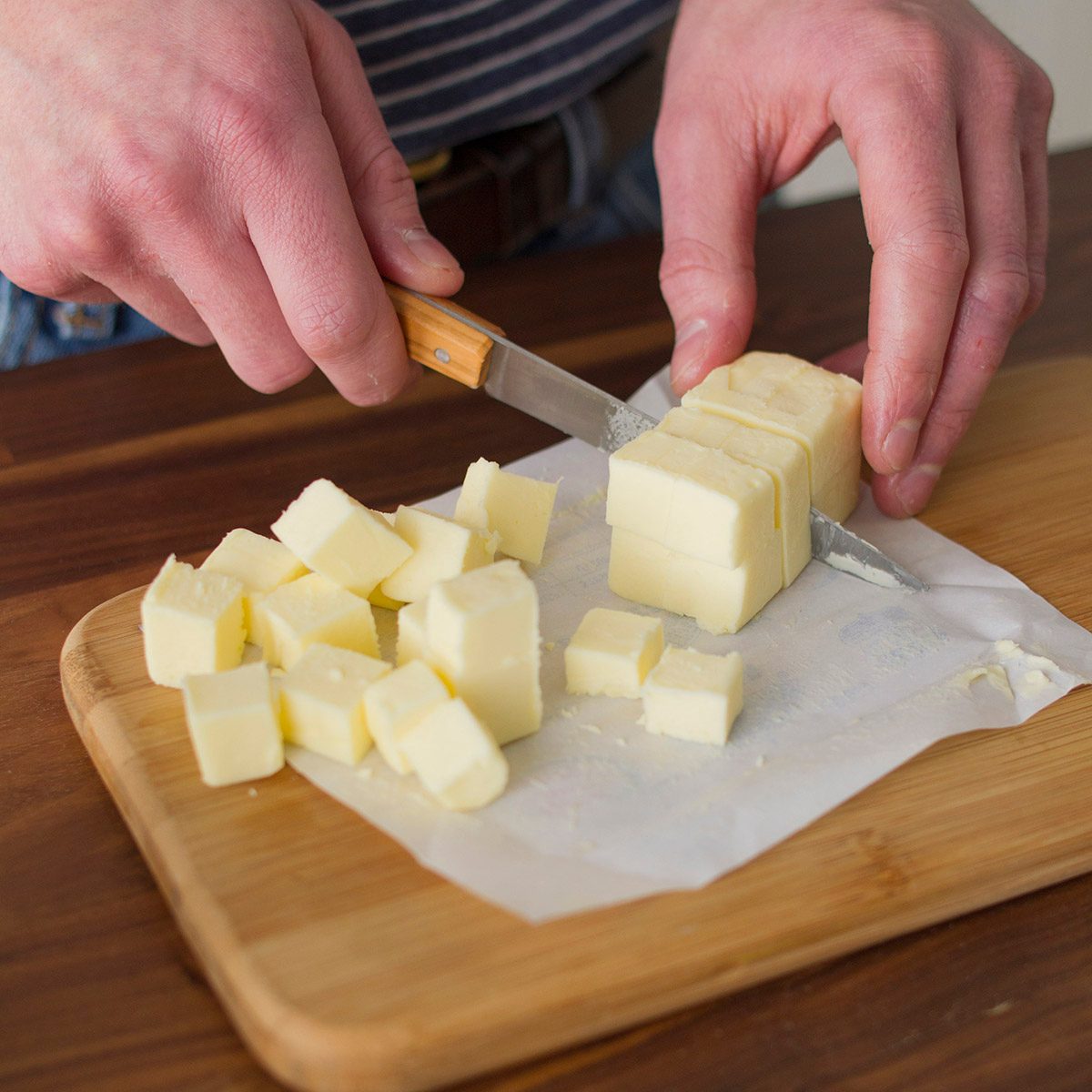If you’re making biscuits, pastry or pie crust, you’ll often see that recipes call for cubed butter. You can also use grated butter. Break out the box grater and grate very cold (even frozen) butter on the side with the largest openings. This will create small bits of butter that are easy to incorporate into the dough.