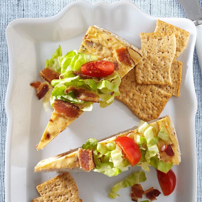 Did you know that cheesecake could be savory instead of sweet? Tomato and green onions mixed with cream cheese is like an irresistible form of gazpacho. Served on lettuce, the BLT version is great on its own, but it’s also a tasty appetizer when served with crackers. This is a flexible recipe, so use other cheese in place of the Gruyere, and add olives, crab meat, cooked mushrooms—whatever strikes your fancy. —Joni Hilton, Rocklin, California