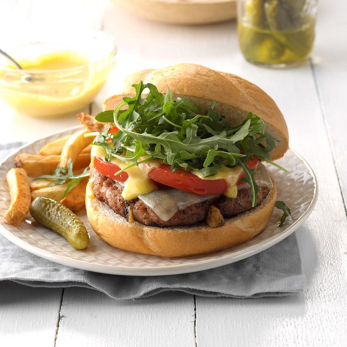 My family loves my ham loaf, so I decided to make the ham loaf mixture into patties and grill them—it was an instant hit. Adding the arugula gives these burgers a peppery bite and honey mustard dressing adds just the right sweet and sour flavor. —Susan Bickta, Kutztown, Pennsylvania