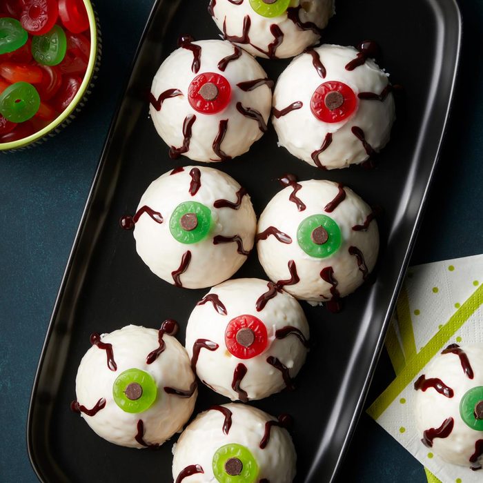 You better keep an eye on these fun treats before they disappear! These cake donuts are dipped in white glaze and drizzled with dark red corn syrup. Gummy candies and chocolate chips are used for the rest of the design. They're fun, creepy and so delicious. —Ronna Farley, Rockville, Maryland