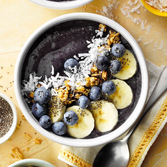 Some of my favorite foods are blueberries, almond milk and date syrup, so I used them to invent this blueberry papaya smoothie bowl. I almost always have these ingredients at home, so I can whip up a smoothie bowl any time. —Andrea Potischman, Menlo Park, California