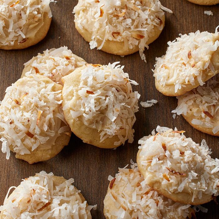 Coconut lovers will have extra reason to celebrate when they taste these cakelike drop cookies. The generous frosting and coconut topping make them a hit at holiday cookie swaps. —Donna Scofield, Yakima, Washington