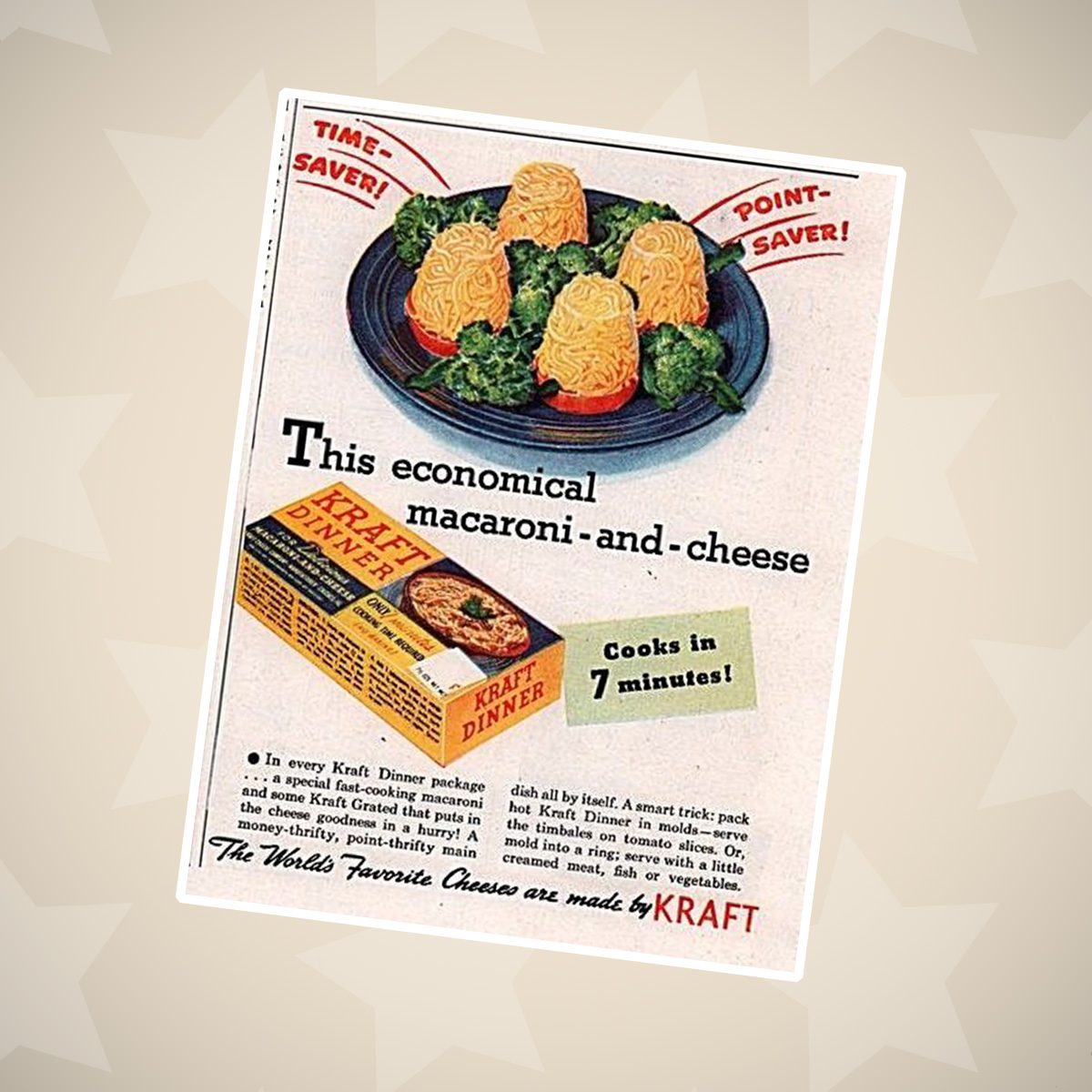 “A meal for 4…in 9 minutes.” That slogan appeared on yellow boxes of Kraft Macaroni & Cheese Dinner, which first hit supermarkets in 1937. The 19¢ meal proved popular during the economic hardships of the Great Depression. The blue-colored box? It didn’t appear until 1954.