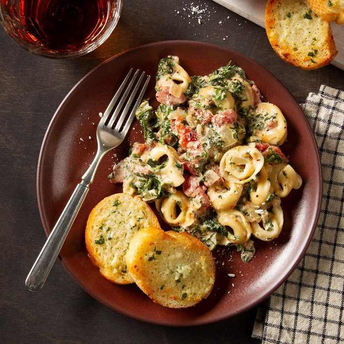 From the Recipe Creator: This tortellini with tomato cream sauce is warm and satisfying. Put spinach, tomatoes and other pantry staples to use in the colorful dish. —Barbra Stanger, West Jordan, Utah