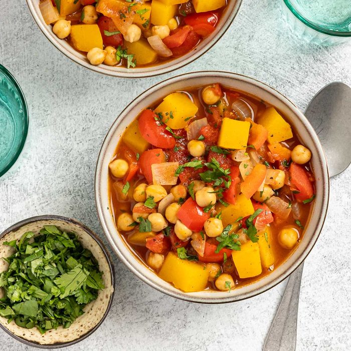 This nourishing soup, which comes together in just a half hour, is packed with vibrant spices, butternut squash and chickpeas. To make this stew in a slow cooker, start by sauteing the vegetables on the stove with the spices, then add everything into the slow cooker and let it cook for about four hours.