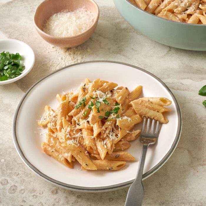 Paired with soft garlic breadsticks and a side salad, this restaurant-worthy pasta makes a simple vegetarian feast. We love penne, but the sauce of tangy tomato paste, rich cream and bright white wine is irresistible on just about any pasta shape.