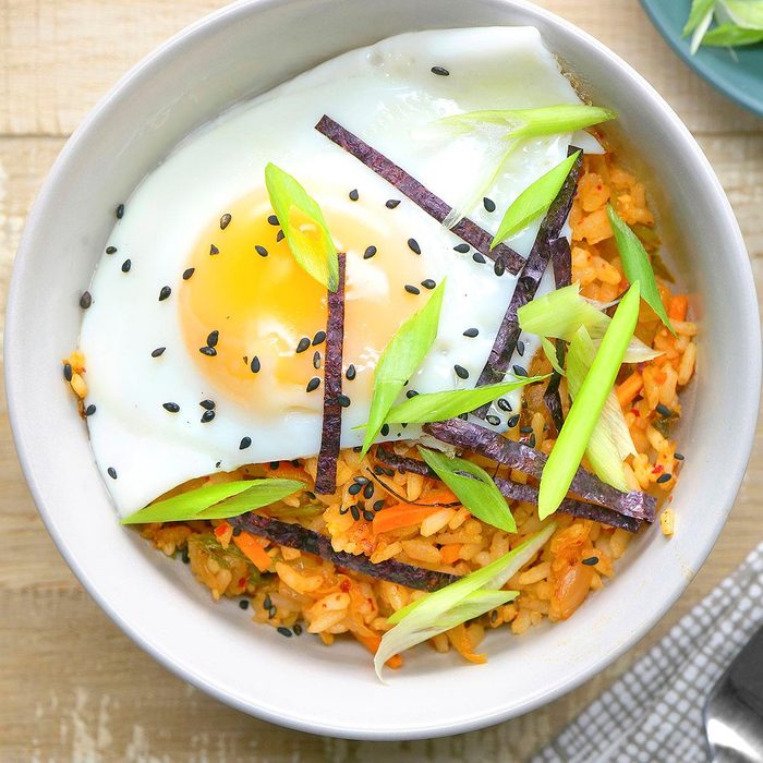 Topped with an egg and flavored with spicy, gut-healthy kimchi, this simple Korean-inspired fried rice comes together quickly with leftover rice. If you’re intimidated by the pungent fermented cabbage, read up on all the amazing health benefits of kimchi, and you’ll be sold.