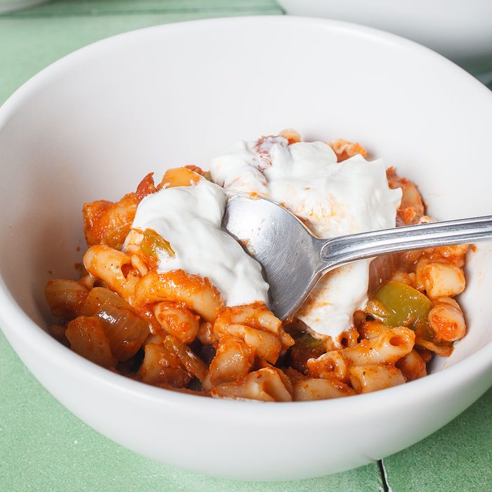 Bean-filled vegetarian chili mixed with elbow macaroni is one of those comforting cold weather foods you’ll want to make again and again. Plus, it keeps well in the freezer for up to three months, so you can heat up any leftovers on busy weeknights. Top the dish with sour cream and chopped green onions.