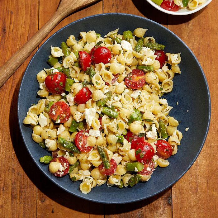 From the Recipe Creator: Straying from heavier, mayonnaise-based pasta salads, I created this lighter olive oil-based salad. Lemon juice, feta cheese, garlic and tomatoes brighten up this colorful and bright dish. —Laurie Sisco, Kingsley, Michigan