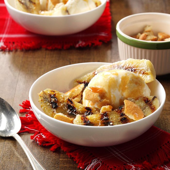 Making this classic New Orleans dessert on a barbecue gives the bananas grill marks that look gorgeous when you bring the dish to the table. Just be sure to keep your bananas inside the peel when you slice them in half. The fruit will soften and turn mushy (in a good way) as it cooks, and it would be a real pain to turn the bananas without the peel providing a little structure.