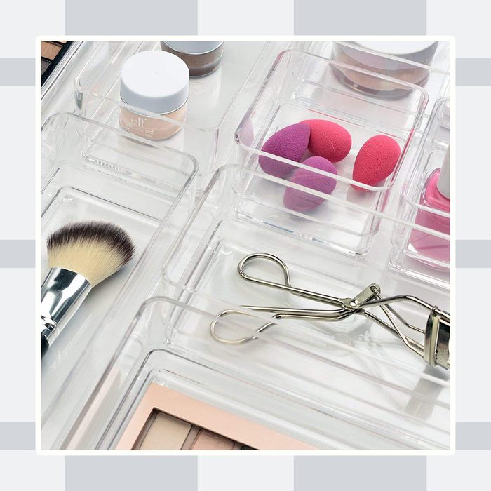 Hair ties, makeup brushes, nail clippers and more can make a tangled mess in a drawer. Keep like items together by using modular organizers, AKA one of the best bathroom organizing products. With these organizers, you can customize any drawer with two each of the following: 3 inch x 3 inch, 6 inch x 3 inch, and 9 inch x 3 inch nesting and sliding compartments.