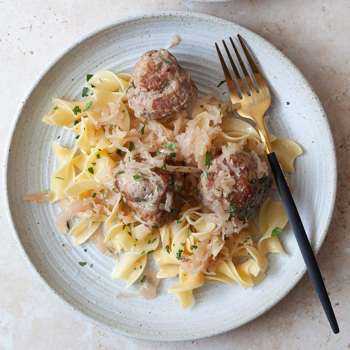 This is one of our favorite main dishes. Because we raise our own pork and beef, the meat we use is always freshly ground. For variety, these meatballs can be cooked with a sweet cream gravy or steamed with tomatoes. But we prefer them with homemade sauerkraut. —Iona Redemer, Calumet, Oklahoma