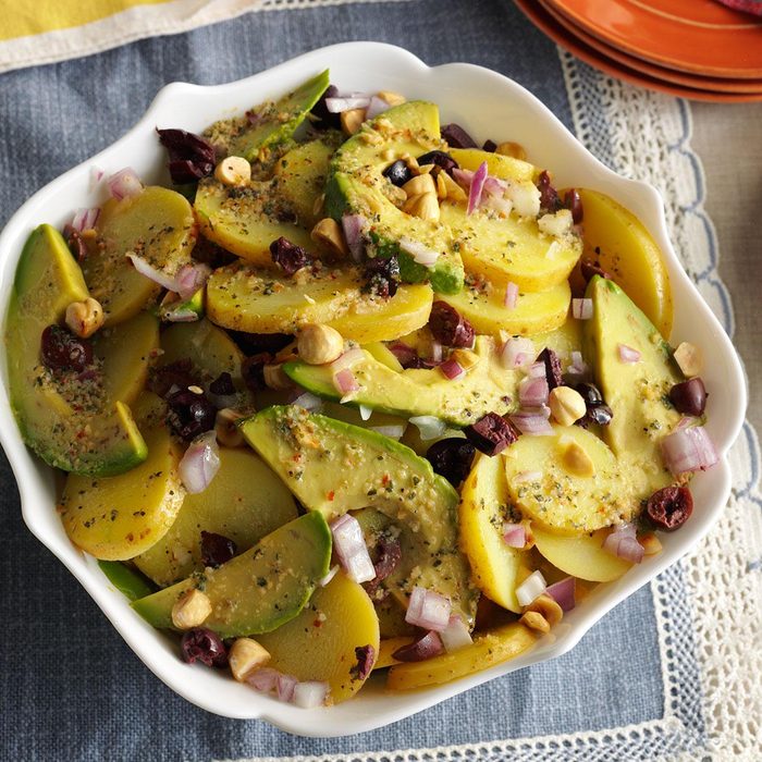 Potato salad tossed with vinaigrette has a lighter taste than traditional mayo versions. I add velvety avocado and hazelnuts for cool texture and crunch. —Laurie Bock, Lynden, Washington