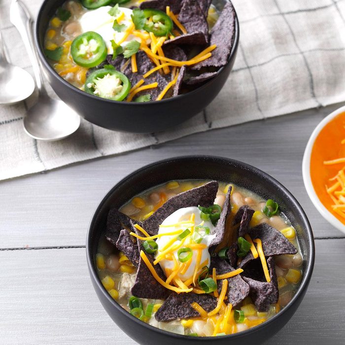 This slow-cooker chicken enchilada soup is inspired by the Mexican dish and loaded with flavor from poblano peppers and enchilada sauce. You can use leftover rotisserie or shredded chicken to make this soup.