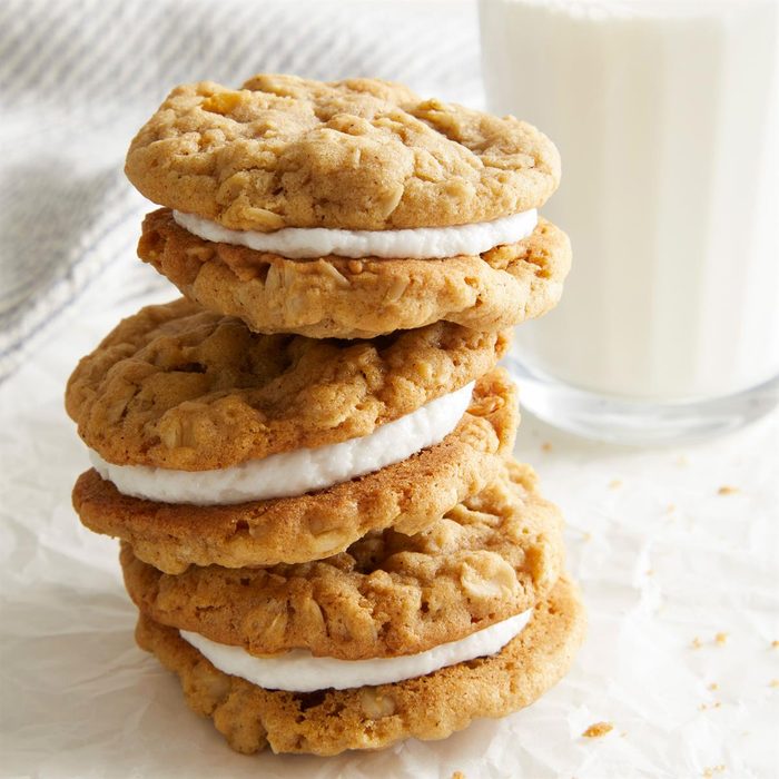 These fun treats put a sweet, fluffy filling between two chewy oatmeal cookies. The old-fashioned flavor is deliciously homey—always perfect for holiday trays. —Jan Woodall, Indianapolis, Indiana