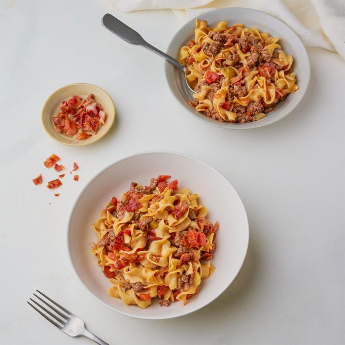 Bacon adds crunch to this comforting stovetop supper my mom used to make when I was a kid. Now I prepare it for my own family. —Kelli Jones, Perris, California