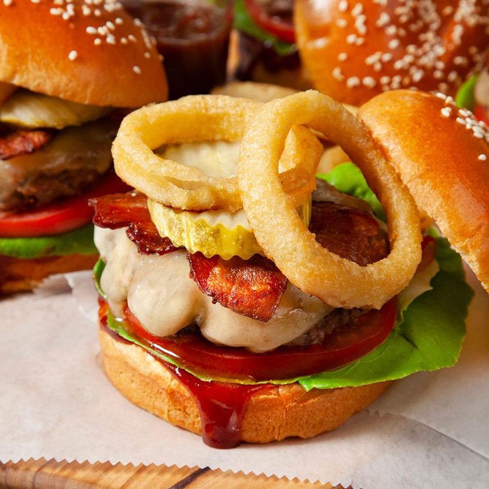 From the Recipe Creator: Every family has a burger of choice, and this is ours. It's stacked tall with bacon and crunchy onion rings. —Paula Homer, Nampa, Idaho