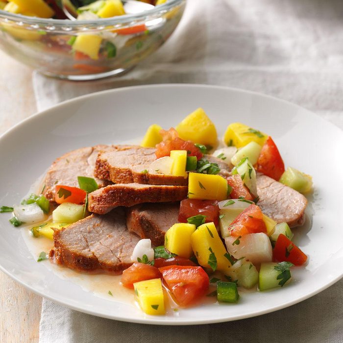 Colorful mango relish is a refreshing counterpoint to the “heat” in the meat rub I use to pep up a number of pork dishes. These roasted tenderloins are sure to turn out nice and juicy. —Gloria Bradley, Naperville, Illinois