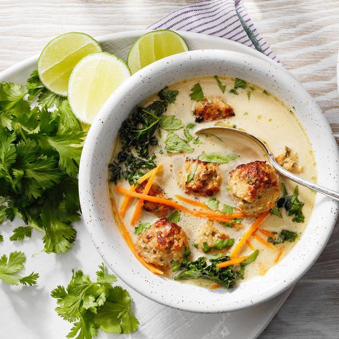 This son-approved, Thai-inspired soup—with meatballs, kale, carrots and creamy coconut milk—is warm deliciousness on a chilly day. —Arlene Erlbach, Morton Grove, Illinois