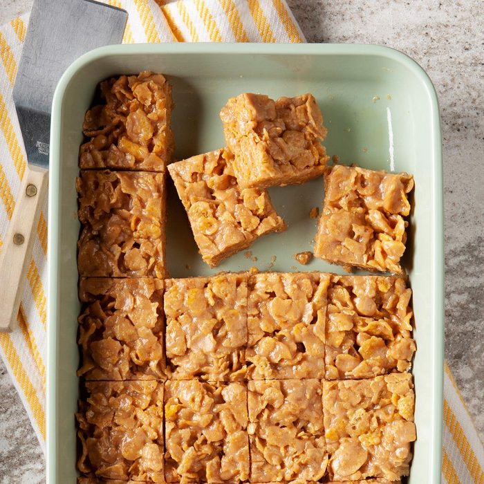 Peanut Butter Cornflake Bars were one of my favorite treats when I was a little girl. They are very versatile. A friend likes to spread a cup of melted chocolate chips over the top. Be sure to let the chocolate set before cutting into these simply delicious bars. —Laura Campbell, Lisbon, Maine
