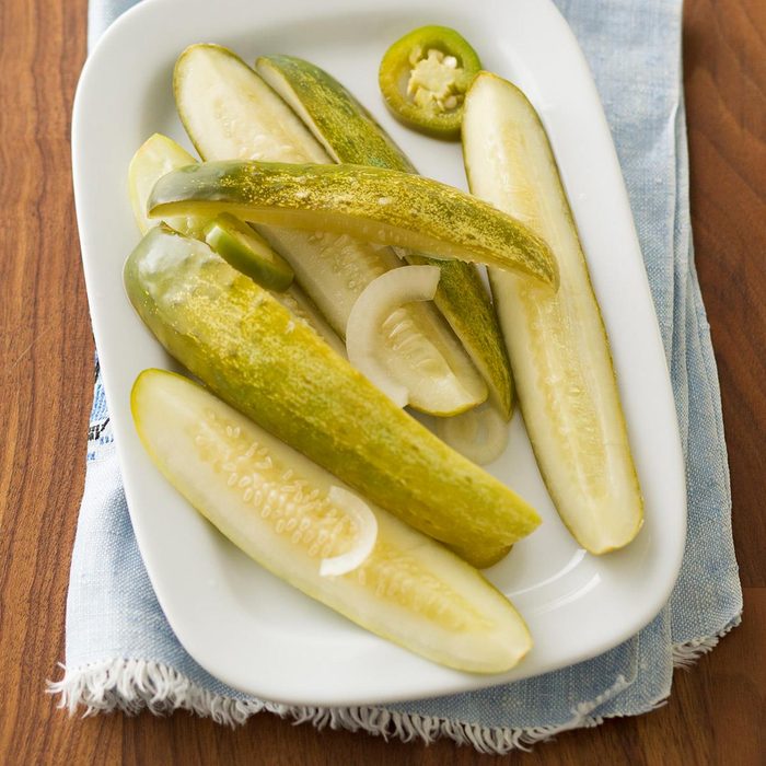 These quick pickled cucumbers have a mild kick of heat from sliced jalapenos, but if you want your pickles to be scorching hot, use a spicier pepper instead. Check out our guide to peppers to help you pick the right one.
